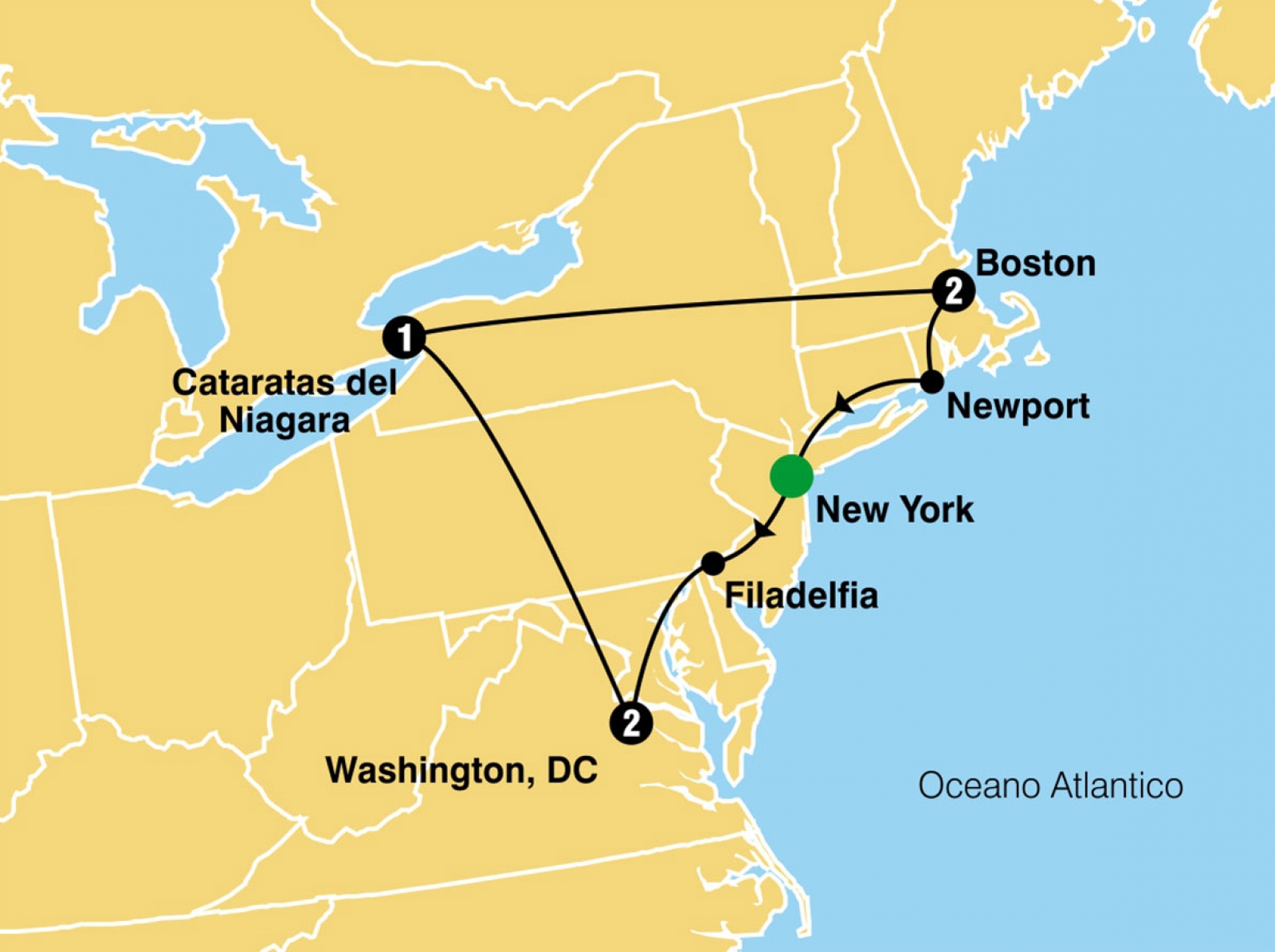 Salida desde Nueva York, visitando: Filadelfia, Lancaster, Washington, Niágara, Boston y regreso a Nueva York. Salida los viernes de Marzo a Diciembre.