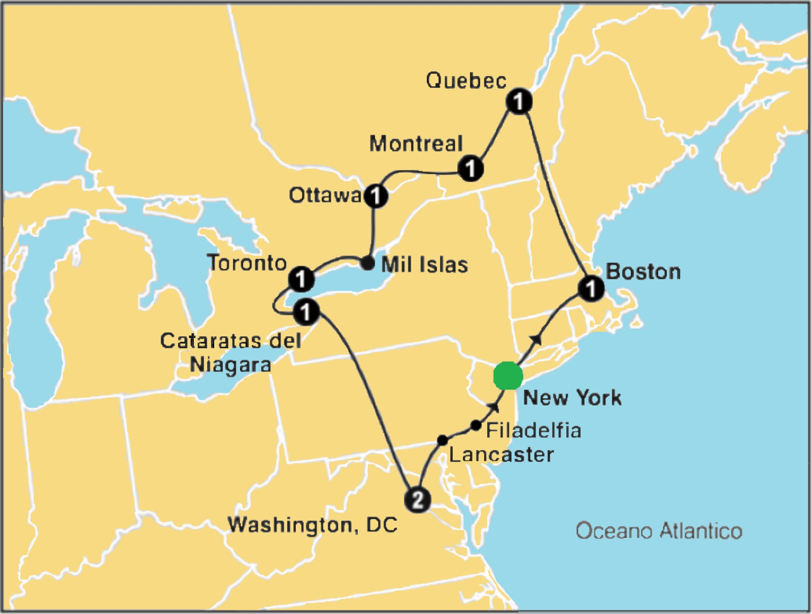 Salida desde Nueva York, visitando: Boston, Québec, Montreal, Ottawa, Toronto, Niágara, Washington, Lancaster, Filadelfia y regresando a Nueva York. Circuito con salidas de Marzo a Diciembre.
