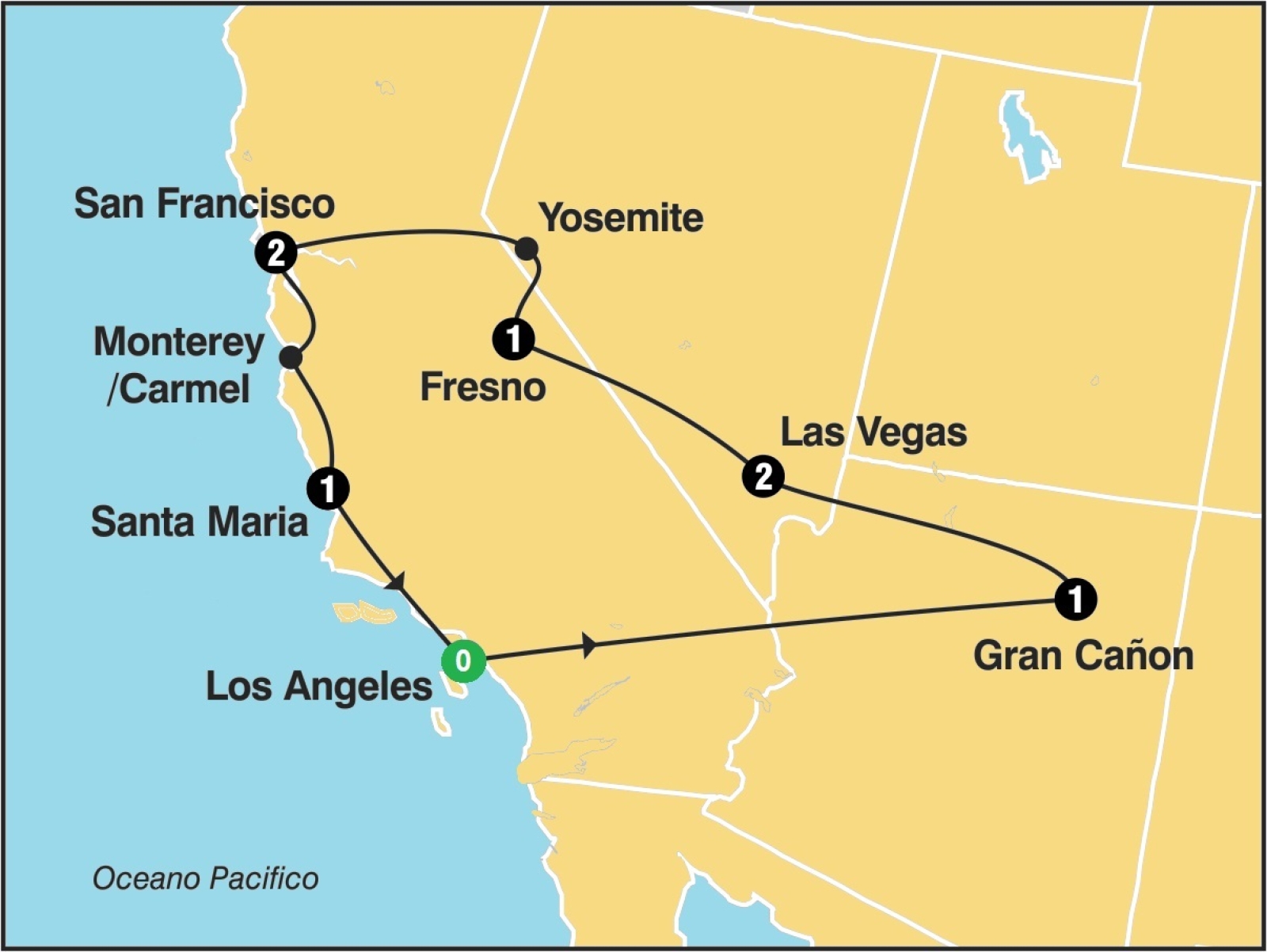 Salida desde Los Ángeles, visitando: Gran Cañón, Las Vegas, Oakhurst, Yosemite, San Francisco, Monterrey, Carmel, Santa Bárbara y regreso desde Los Ángeles. Circuito con salidas desde Enero a Diciembre.