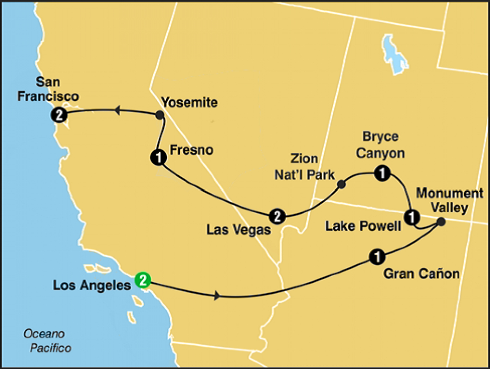 Salida desde Los Ángeles, visitando: Gran Cañón, Monument Valley, Bryce Cañón, Zion, Las Vegas, Yosemite y regreso a San Francisco. Circuito con salidas miércoles de Marzo a Octubre.