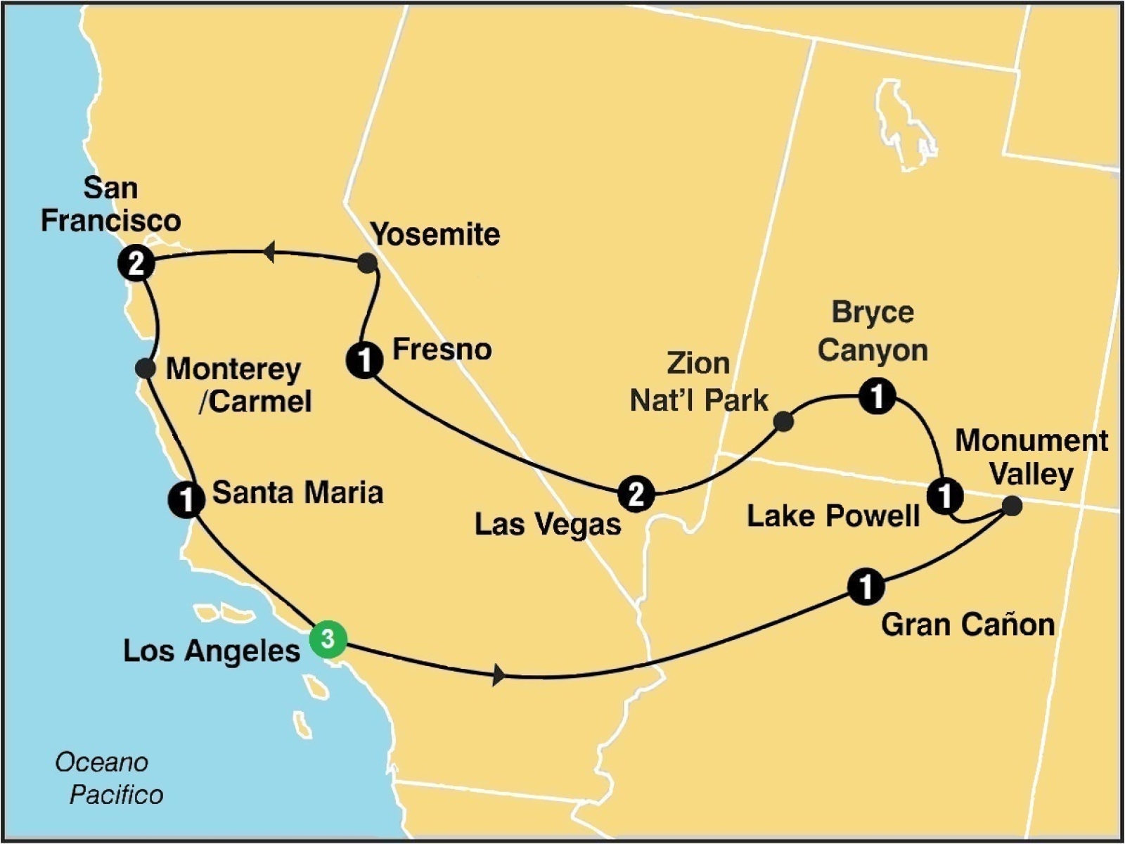 Saliendo desde Los Ángeles, visitando: Gran Cañón, Page, Cañón Antílope, Lake Powell, Cañón Bryce, Zion, Las Vegas, Mammoth Lakes, Yosemite, San Francisco, Monterey, Santa Bárbara y con regreso de Los Ángeles. Salidas de Marzo a Octubre.